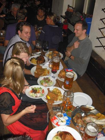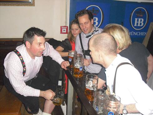 Nachdem wir dann schließlich alle das Hofbräuhaus erreicht hatten, waren wir natürlich schnell die Stars. Uns wurde gleich ein pfiffiger Kellner zugeteilt, weil man direkt erkannte, die haben Durst. An dieser Stelle muss dann auch mal erwähnt werden, das ein Unterzeichner des Vertrages vom letzten Jahr ohne entsprechende Tracht erschien. Er durfte trotzdem an unserem Tisch sitzen bleiben, nachdem er Besserung für´s nächste Jahr geschworen hatte und einen gewissen Obolus entrichtet hatte. Jener junge Herr war darüber auch so glücklich, dass er von Anfang an einen guten Zug an den Tag legte und den ganzen weiteren Abend über´s ganze Gesicht strahlen sollte.