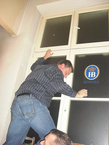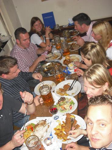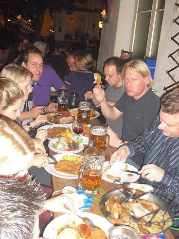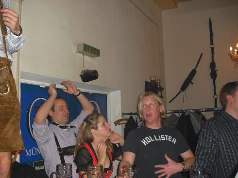 Nachdem dann alle gesättigt waren, kamen die ersten Rufe nach den ersten Kümmerlingen auf. Eine weitere Tradition unseres Oktoberfestes. - Doch was ist das??? Kein Kümmerling im Haus!!!! - Wie bitte??? - Das kann doch wohl nicht wahr sein! - Pures Entsetzen unter allen Beteiligten. - Erhitzte Diskussionen mit dem Personal folgten, dem folgten zwei Tests, wilder Keiler und Williams Birne, die beide nicht den Ansprüchen genügen konnten. Teilnehmer wollten schon aus den Fenstern springen. Gott sei Dank waren diese auch bis oben komplett verriegelt. Fazit für das nächste Jahr, wir werden das Hofbräuhaus unser Kommen ankündigen und darauf hinweisen, dass an jenem Abend Kümmerling in ausreichenden Mengen zur Verfügung zu stehen hat.