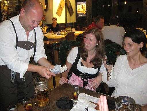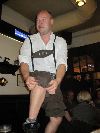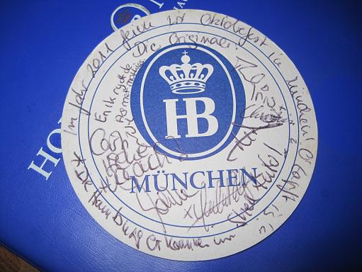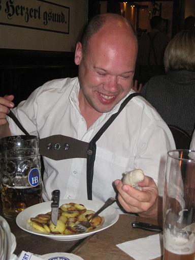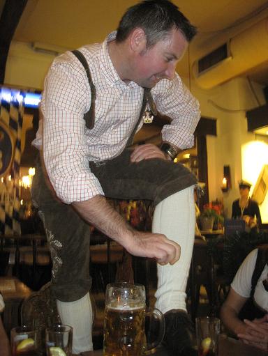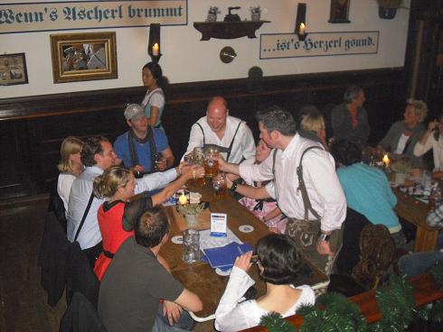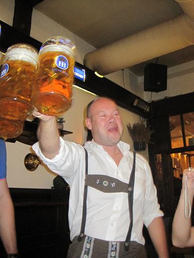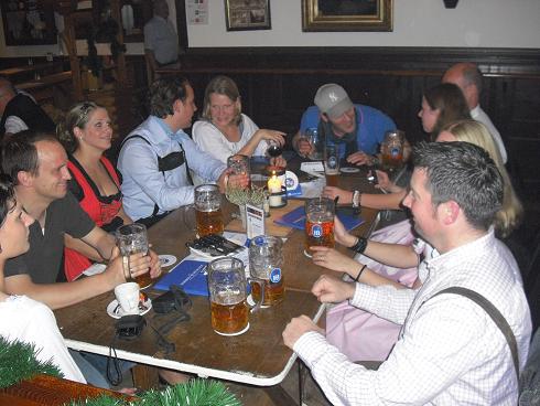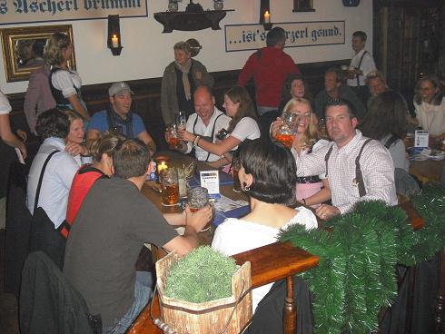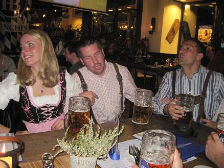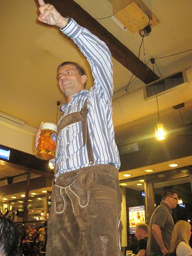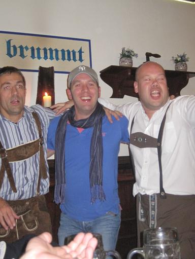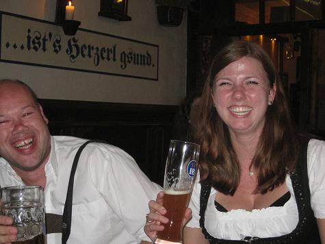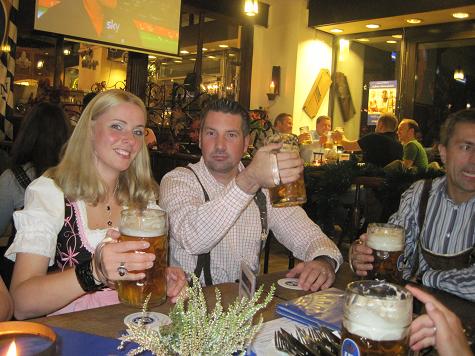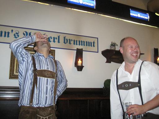 So und nun sollte ich in normalen Klamotten zum Oktoberfest, ach Mensch, hätte doch jemand vorher was gesagt, dann hätte ich meine Lederhosn natürlich mitgenommen:-( Während ich noch am zetern war, stand Christiane plötzlich in der Tür und hielt meine Lederhosn in der Hand. Sie hatte es doch tatsächlich fertig gebracht, diese heimlich wieder mit nach Hamburg zu schmuggeln. So, jetzt gab es trotzdem noch ein Problem, ein passendes Hemd und die passenden Schuhe lagen irgendwo in dem bis unters Dach bebackten Wagen. Also runter mit Huili, den halben Wagen wieder ausräumen und die entsprechenden Sachen rausholen. Tja und dann war auch ich soweit und vollends glücklich. Ach es ist doch herrlich zu wissen, dass man Freunde hat, die dann auch noch so eine überraschende Abschiedsparty organisieren. Also konnte es dann in Tracht mit dem Taxi zum Hofbräuhaus gehen.