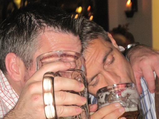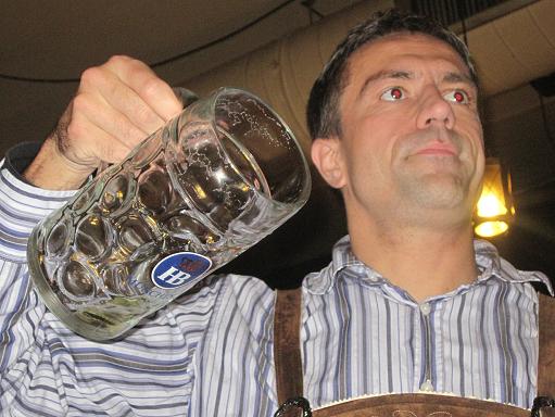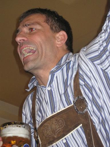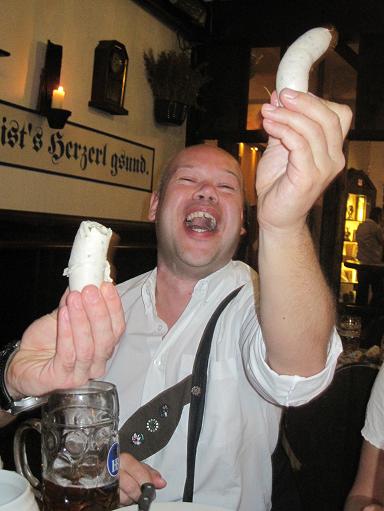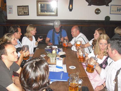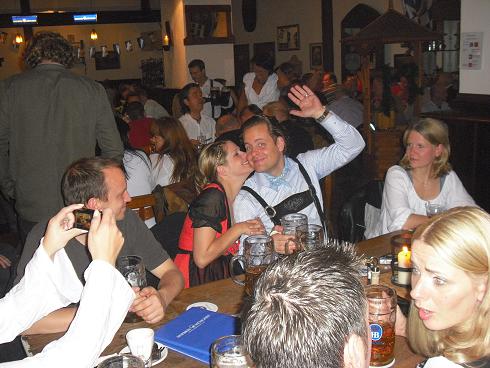 Man, man, einige haben gleich ein Tempo vorgelegt, na und wer mich kennt, weiß natürlich, dass ich dem in nichts nachstehen wollte. Der erste Krug war praktisch schon leer, eher er die Tischplatte gesehen hatte. Also, wenn das hier ein einigermaßen glimpfliches Ende nehmen soll, dann heißt es jetzt erst Mal eine Grundlage schaffen, tja und da musste der Luxemburger doch dem Holländer erst Mal zeigen, wie man ne Weischwurscht schlurft. Aber der Holländer ist ja nicht dumm und hatte den Trick schnell raus;-)