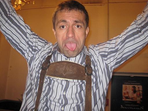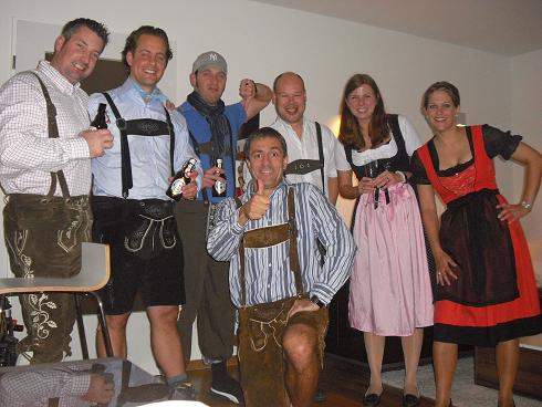 Ich hatte mich bereits die ganze Woche damit rumgeplagt, welche Sachen ich bei der ersten Überfahrt nach Turin mitnehmen sollte und was noch in Hamburg bleiben sollte. Letztendlich stand der Wagen bis unters Dach bepackt bereit zur frühen Abfahrt am Samstag Morgen. Zum Abschluss hatten Christiane und ich noch mal beschlossen, richtig nett Essen zu gehen. Während ich schon halb verhungert oben am drängeln war, jetzt endlich Essen zu gehen, machte sich Christiane in aller Ruhe fertig, als es plötzlich an der Tür klingelte. Beate und Christian standen vor der Tür, sie wollten sich ja noch von mir verabschieden. Ok, also ne Bierlänge sollte noch Zeit sein, ich also groß am erklären, dass wir gleich nett Essen gehen wollten uns so und frag mich schon, warum die beiden die ganze Zeit so Grinsen. Aber es war klar, die beiden mussten gleich wieder los, da sie selber zu Haus Besuch erwarteten. Da klingelt es ein weiteres Mal. Wer steht dieses Mal vor der Tür???? Mein Ex-Mitbewohner in Lederhosen und neben ihm Iris mit Dirndl in der Hand. Ok, jetzt wurde mir langsam klar, ich werde wohl auch in diesem Jahr das Oktoberfest in Hamburg feiern. Aber hey Scheiße, ich habe doch meine Lederhosen zwecks Reparatur (mir waren auf der Was´n zwei Knöpfe abgerissen worden) im Emsland gelassen und Oktoberfest ohne Tracht ist dämlich. Hin und her gerissen zwischen Freude und Enttäuschung durfte ich erneut die Tür öffnen. Matti und Maike, natürlich auch in voller Montur trafen ein und es folgten noch der Holländer und der Luxemburger, welche sich extra Hosen für dieses Event ausgeliehen hatten.