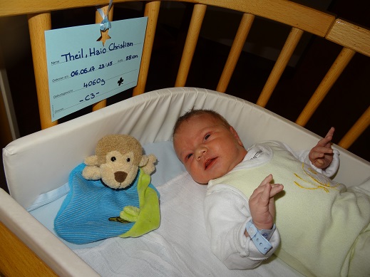 Also, ich bin der Haio, bin am 6.6. zur Welt gekommen und habe schon mal an Gewicht und Größe meinen angeblich großen Bruder locker überboten. Man sagt mir nach, mit meinen 4060 g und 58 cm, dass ich ein ganz schön stattliches Kerlchen sei. So und hier jetzt ein paar erste Bilder von mir und wer auf das Bild mit den Eckdaten klickt, bekommt diese auch noch mal ein wenig musikalisch untermalt präsentiert;-) Sollte es mit auf dem Bild klicken nicht klappen, dann hier klicken!