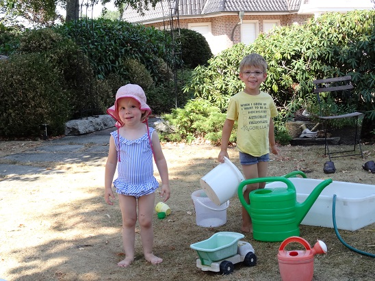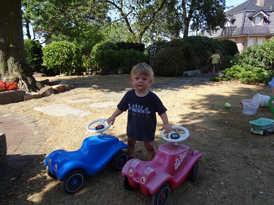 Logisch, wenn wir dann schon mal in Mamas und Papas alte Heimat fahren, dann bleiben wir in der Regel auch gleich ein paar Tage da. Ist ja auch super, bei Oma und Opa kann man super im Garten spielen, die haben ja viel mehr Platz, als wir in Hamburg. Da darf man dann auch nach Lust und Laune mit Wasser spritzen. Johanna und ich helfen Oma dann auch immer mit Vergnügen beim Blumen gießen.
