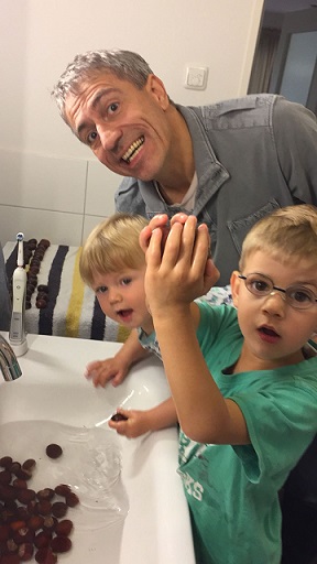 Also ich bin immer froh, wenn Papa nicht unterwegs ist und Zeit hat mit uns zu spielen. Der macht immer so tolle Sachen mit uns, so habe ich auch meine erste Kastanienzeit so richtig miterleben können. Da gehen wir dann zu dritt los, ich zeige aus dem Kinderwagen, wo all die Kastanien liegen und Papa und Joris sammeln sie dann ein. Anschließend waschen und trocknen wir dann alle und dann nehmen wir sie mit in die Kita, da freuen sich dann alle und wir basteln damit etwas.