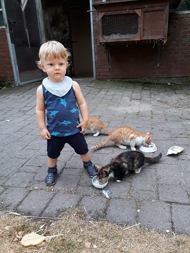 Bei Oma und Opa habe ich auch schon meinen eigenen Fuhrpark und da gibt es ganz, ganz viele Tiere. Wir helfen jetzt Oma immer beim Katzen füttern, aber eine Katze hat ja meinen Bruder gekratzt, das war nicht nett und mein großer Bruder brauchte ein Pflaster, so wie der Dino vom HSV.