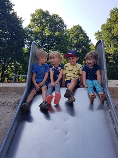 Wir treffen uns natürlich nicht immer bei mir zu Hause, hey, dafür war das Wetter im Sommer 2018 ja viel zu gut. Meistens treffen wir uns dann auf dem Spielplatz, da sind dann eh noch viele andere Kinder und manchmal treffe ich da auch Kinder, die alle fast genauso alt sind wie ich, denn dann treffen wir uns mit Müttern aus Mamas alten Babystammtisch.