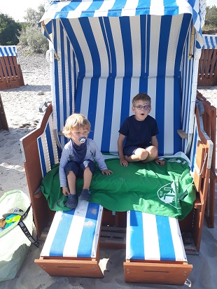 Logisch dass wir natürlich auch selber Baden gegangen sind. Ok, ok, ok, die Wellen waren ganz schön hoch, da bin ich dann doch lieber immer auf Papas Armen ins Wasser gegangen. Wir hatten auch einen festen Strandkorb für den gesamten Urlaub, da konnten wir uns dann auch zwischendurch immer mal wieder ausruhen. Also ihr könnt euch ja sicherlich vorstellen, Buddeln, Schwimmen, Buddeln, Quallen sammeln, Buddeln, hey, das geht dann ganz schön an die Substanz.