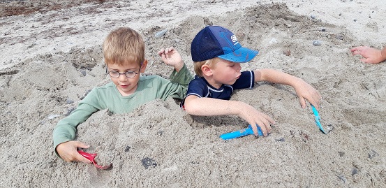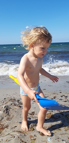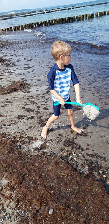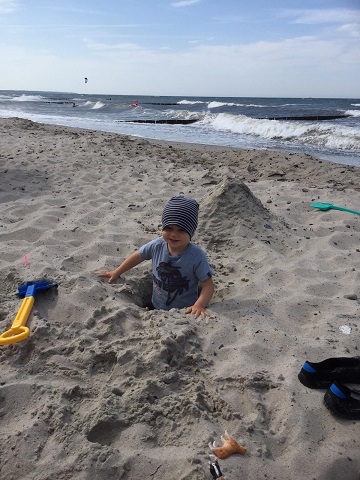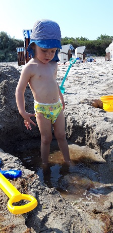 Boh, was haben wir da gebuddelt. Ich könnt es euch nicht vorstellen, ob unsere eigenen kleinen Matschlöcher oder dicke Burgen oder wir haben uns einfach selber eingebuddelt. Puhhh, da musste ich aber mit meiner kleinen Eiskugelschaufel ganz schön lange graben, bis ich und mein Kumpel da wieder raus waren;-)) Haio hat übrigens meine Freude am Steine ins Wasser werfen übernommen. Er wirft zwar noch nicht ganz so weit, wie ich, aber es macht auch schon immer ganz schön "PLATSCH!!!"