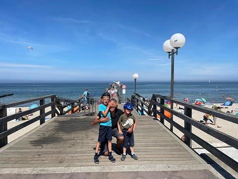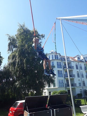 Wir haben aber nicht nur einfach am Strand gelegen, wie immer standen auch einige Ausflüge auf dem Programm. Mama wollte zum Beispiel wieder gerne nach Warnemünde, weil man da auch ein wenig shoppen kann. Tja, damit wir dann mitkommen, gab es natürlich eine Bedingung. Wir kommen nur mit, wenn wir auch in ein Spielzeuggeschäft gehen und wir uns dort was aussuchen dürfen. Wir hatten Mama schnell überzeugt und auch für uns gab es ja immer wieder besondere Sachen zu erleben auf diesen Ausflügen. Ich bin zum Beispiel zum ersten Mal in meinem Leben auf einem großen Trampolin an Seilen ganz hoch gehüpft. Es gibt Kinder, die können dann schon Überschläge, dafür muss ich aber dann doch noch ein wenig üben, aber es hat auch so schon riesigen Spaß gemacht.