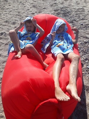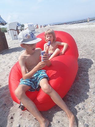 Papa hatte dann dieses Jahr kurz vor unserem Urlaub noch so einen komischen "Sack" erstanden, den hält man einfach mal in den Wind, dann dreht man ihn vorne ein und schwupps hat man den perfekten Platz um sich auszuruhen, oder auch Eis zu essen. Logisch, wir hatten natürlich ganz schnell raus, dass wenn der eine auf einer Seite sitzt und der andere auf die andere Seite springt, man richtig hoch geschleudert wird. Haben wir wohl letztendlich ein wenig übertrieben, auf alle Fälle war die Luft zum Schluss immer schneller raus und der Sack hat den Urlaub nicht wirklich überlebt;-)