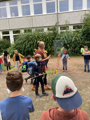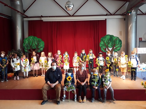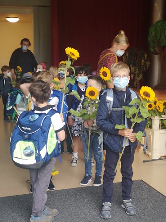 Die haben uns Neulinge in der Schule auch wirklich toll empfangen. Die 4. Klasse hat ein tolles Theaterstück für uns gespielt und die 2. Klasse hat Spalier gestanden und mit Fähnchen gewunken, als wir von der Aula zum ersten Mal in unseren Klassenraum gegangen sind. Hey und ich durfte gleich ganz vorne gehen;-)