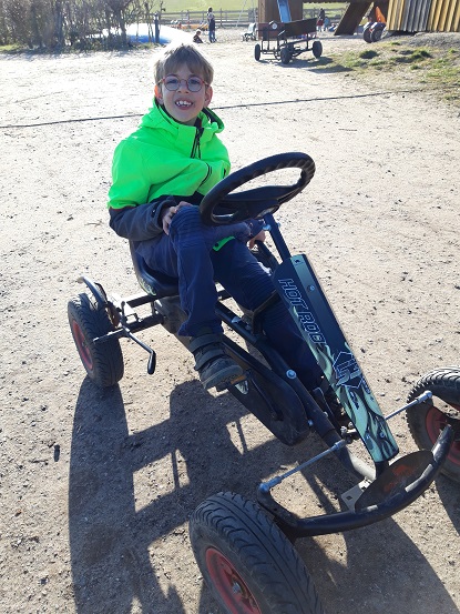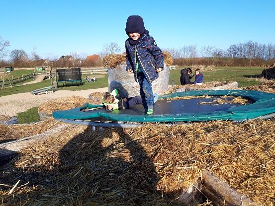 Aber wenn dann die Sonne scheint, dann nutzt man natürlich auch all die 1000 Spielmöglichkeiten draußen, die haben da so viele Fahrzeuge, mit denen man über den Hof düsen kann und überall sind Trampoline aufgebaut, manchmal einfach mitten zwischen Strohballen. Wir wollten dann da überhaupt nicht mehr weg und Papa musste schon all seine Kräfte aufbringen, um uns von dort wieder wegzubekommen.