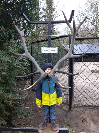 Ok, ok, ok, kommen wir wirklich nur wegen der Tiere in den Tierpark? Nee, jetzt mal ehrlich, klar die Tiere sind uns auch wichtig, aber im Tierpark kann man ja auch noch viele andere tolle Sachen machen. In der Regel, wenn wir denn da sind und wir waren in diesem Jahr schon dreimal dort, dann fällt auch noch was anderes für uns ab. Eine Fahrt durch den Erlebnispark, oder ein Eis und hey, ich muss ja eh jedes Jahr am Hirschgeweih prüfen, ob ich denn auch wirklich schon wieder gewachsen bin;-) Wisst ihr noch, letztes Mal kurz vor meinem 3. Geburtstag musst ich mich noch bücken, um drunter her schauen zu können und nicht verdeckt zu werden, jetzt schaue ich schon locker drüber weg.
