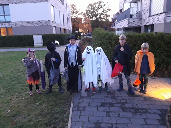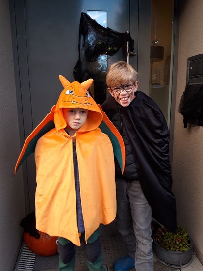 Als Fledermaus und als Pokemon-Drache machten sich mein Bruder und ich mit noch anderen aus der Nachbarschaft auf, um möglichst viele Süßigkeiten zu ergattern. Süßes oder Saures - wir sind die kleinen Geister und essen gerne Kleister und wenn Sie uns nichts geben, dann bleiben wir hier kleben!