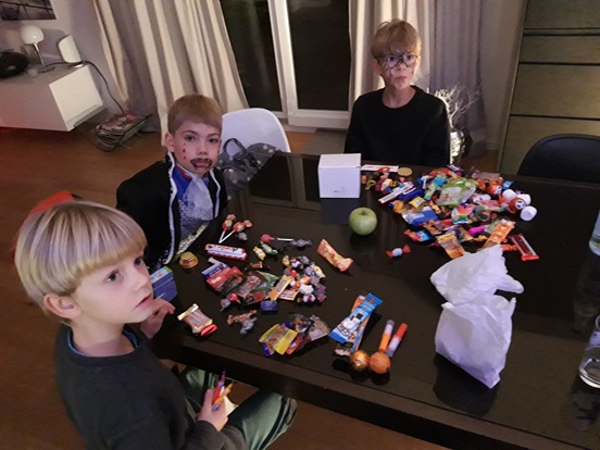 Natürlich wollte keiner, dass wir vor der Tür kleben bleiben und so hat man uns reichlich mit Süßigkeiten bedacht. Klar haben wir die dann auch mit unseren Freunden "brüderlich" geteilt. Übrigens, es ist ja nicht so, dass nur die Kinder an Halloween auf ihre Kosten kommen, nein, nein auch für die Erwachsenen fällt dabei oft genug was ab, aber das ist dann eher flüssig als fest.