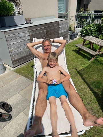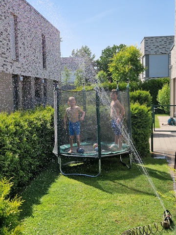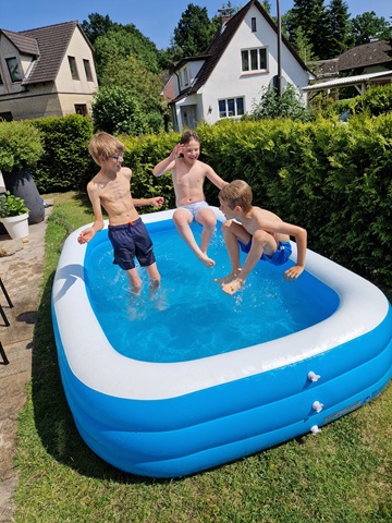 Sommer ist einfach geil, auch hier in Hamburg. Selbstredend, dass wir direkt den Pool aufgestellt und voll gemacht haben. Da kommen dann auch gerne alle anderen Kinder aus der Nachbarschaft vorbei. Einmal musste Papa dann den Pool wegen Überfüllung für weitere Gäste sperren. Sehr erfrischend ist auch unsere neueste Erfindung - Trampolin springen während der Rasensprenger läuft.