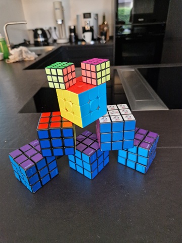 Auch wenn Ferien sind, wollen wir ja weiter was lernen, von wegen treu nach dem Motto dieses Teils unserer Geschichte "Wir erobern die Technik". Könnt ihr euch erinnern? Im März war Papa auf einer Tagung in Wien und hatte uns von dort jeder einen Zauberwürfel mitgebracht. Die waren natürlich schnell alle verdreht. Zum Geburtstag hatte ich dann noch einen Zauberwürfel geschenkt bekommen und wir hatten auch noch kleine und einen alten zu Hause. Aber es dauerte nicht lange, da waren auch alle die verdreht. Puhhh da war ich ganz schön traurig, weil ich wollte einen, der nicht verdreht ist. So gab es nur eine logische Lösung, ich muss mir die Technik des Zauberwürfellösens aneignen. Gebe zu, hat eine Weile gedauert und Papa hat geholfen, aber inzwischen löse ich die Dinger viel schneller als Papa. Wollte dann, als ich den ersten Zauberwürfel gelöst hatte vor Freude einen Backflip machen, tja, aber auch die Technik musste ich mir erst aneignen. Das Ganze habe ich mir dann ganz alleine auf dem Trampolin von einem Freund beigebracht, hat einen Abend - wir waren dort alle zur Gartenparty eingeladen - und dann einen Vormittag gedauert und ich hatte die Technik des Backflips drauf.