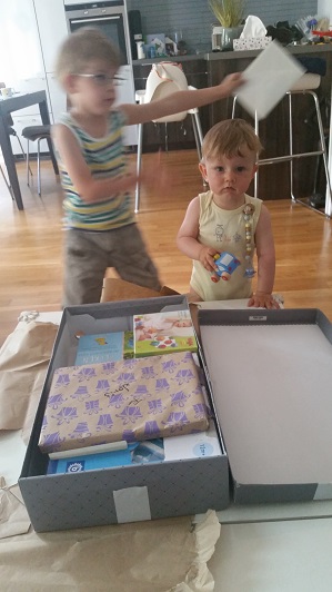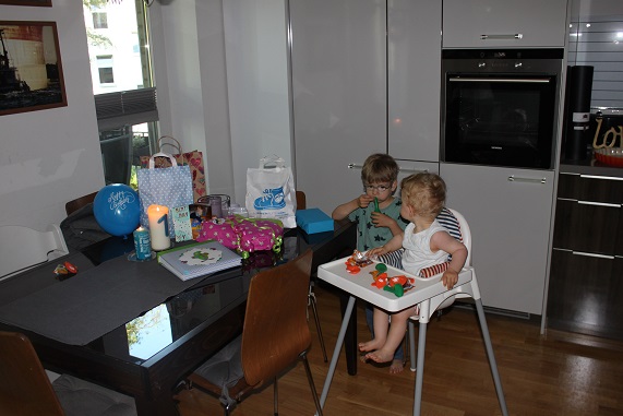 Aber fangen wir doch gleich mal mit dem Hauptthema an. Könnt ihr es euch vorstellen??? Jaaaaa, es ist tatsächlich wahr, ich konnte schon meinen ersten Geburtstag feiern. Also mein Bruder hatte mir ja schon ne Menge erzählt und alle freuen sich immer, wenn sie Geburtstag haben, aber ich hatte ja keine Ahnung. Ey, aber Leute, das ist echt super so ein Geburtstag, man wacht Morgens auf und schon singen alle und dann kommt man zum Frühstücken und der ganze Tisch steht voller Geschenke. Mein großer Bruder war glaube ich anfänglich aufgeregter als ich. Vielleicht war ich auch einfach überwältigt von all den Geschenken, ich habe dann einfach Joris auspacken lassen und ich kann euch sagen, der hat es mit Freuden übernommen.