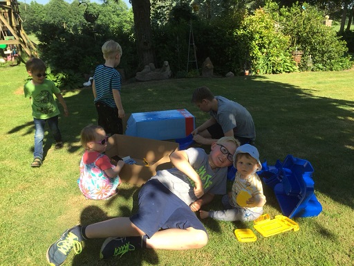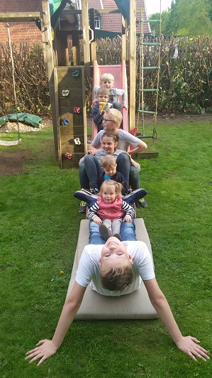 Wie auch immer, im Sommer draußen, das ist einfach die Krönung und wenn wir dann bei unseren Verwandten sind, dann haben wir ja auch immer viel Platz im Garten, da kann man dann immer mit alle Mann nach Lust und Laune spielen und zum Beispiel auch sowas wie ne Wasserbahn aufbauen.