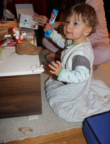 Anfang Dezember bin ich dann auch zum Geburtstag von meiner Cousine gefahren, war super klasse, habe da dann auch meinen Patenonkel mal wieder gesehen und hey, was meine Cousine schon alles kann. Wow, ich hoffe ich kann bald auch so gut klettern. Allerdings hatte ich den Eindruck, dass die Erwachsenen das alle nicht so toll fanden. Verstehe ich nicht, ist doch der Hammer, wie die schon am Schrank hochklettern kann. Also meine Cousine kommt schon überall ran, ich muss immer noch nach oben zeigen und dann schreien, damit ich das bekomme, was ich haben möchte, sie stattdessen holt es sich einfach.