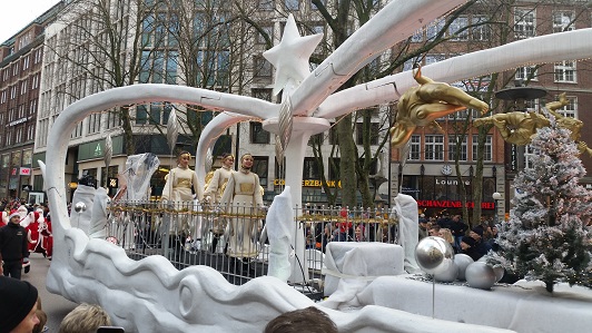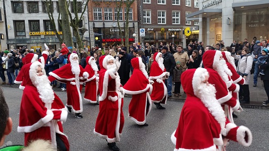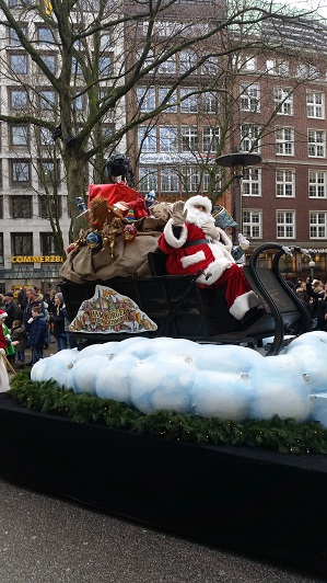 Übrigens, ich weiß jetzt auch, wie der Nikolaus und auch der Weihnachtsmann es schaffen, in nur einer Nacht überall Geschenke hinzubringen. Ha, die sind nämlich nicht alleine, die haben ganz, ganz viele Helfer. Hab nämlich mitbekommen, wie der Weihnachtsmann mit seiner Gefolgschaft in Hamburg angekommen ist. Er muss ja jetzt schon mit den Vorbereitungen anfangen und neben den Engeln und Wichteln hat der auch noch ganz viele Helferlein, die ihm zum verwechseln ähnlich sehen.
