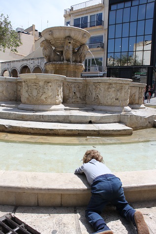 Mama und Papa haben alles versucht, um mich davon zu überzeugen, dass einfach irgendwo drin sitzen, ganz viel Spaß machen kann. Aber hey, selbst in dieser bunten Eisenbahn, die dann auch noch gewackelt hat und komische Töne von sich gab, aber einfach keinen Meter vorwärts kam, wurde es mir schnell zu bunt. Ich will raus und die Stadt selber entdecken. Habe dann am berühmten Morosini- oder auch Löwenbrunnen von 1628 direkt erstmal wieder den Wassercheck gemacht. Also ich fand die Temperatur völlig ok, keine Ahnung, warum Mama und Papa partout nicht wollten, dass ich dort ein wenig plansche.