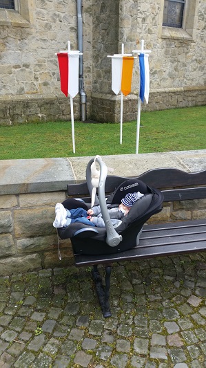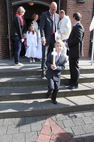 Ich sag euch, wäre dann gerne auch noch länger geblieben, alle anderen sind auf alle Fälle noch ne Nacht geblieben, aber bei uns hieß es schon wieder Termine, Termine, Termine!!! Mein Cousin Theo hatte an diesem Wochenende auch noch Kommunion. Tja, das wollte ich mir dann auch mal aus der Nähe ansehen, alle hatten sich so schick gemacht und sind in die Kirche. Ich hab mir datt Ganze dann von außen ansehen wollen und vor der Kirche auf alle gewartet, nur dann hat datt ganze gedauert und gedauert und gedauert, da muss ich dann wohl doch eingeschlafen sein, als ich wach wurde, waren auf alle Fälle alle schon draußen.