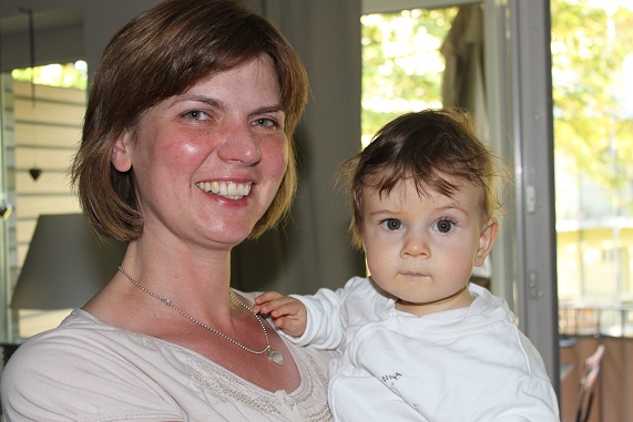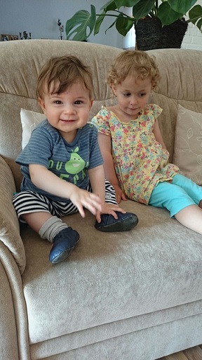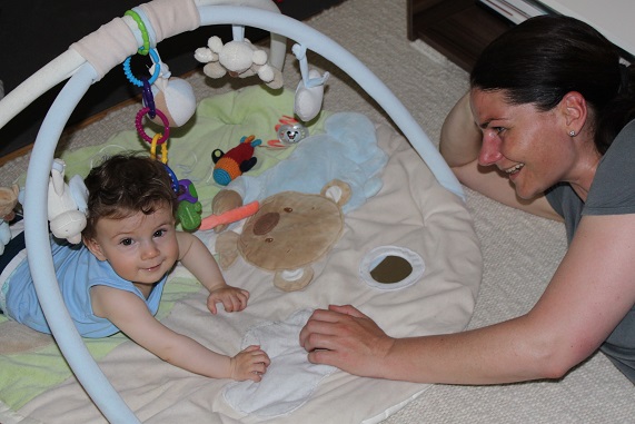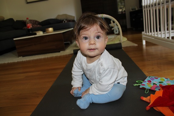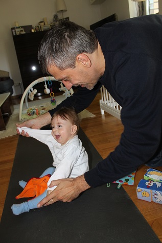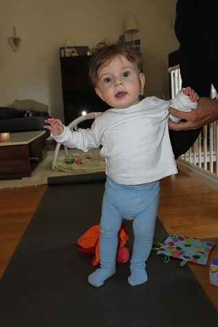 Mit dem Sitzen klappt das inzwischen auch schon ganz gut, wir sind sogar schon einen Schritt weiter, denn ich habe festgestellt, je höher ich bin, umso mehr kann ich entdecken, somit üben wir schon mal langsam aufrecht stehen. Na gut, hier muss Papa noch unterstützen.