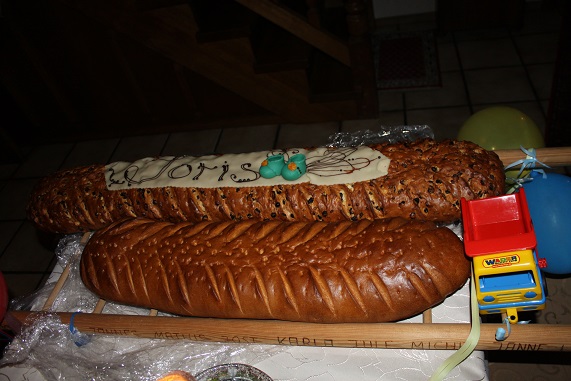 Ich glaube hier bin ich euch dann aber zunächst mal ein wenig Aufklärung schuldig. Viele die hier lesen, werden nicht wissen, was Weggen wegbringen überhaupt ist. Also der Weggen ist ein Hefeteigbrot, aus Weizenmehl, Wasser, Fett, Zucker, Hefe und Salz und in der Regel gibt es dann noch den Korinthen Weggen, der dann noch Rosinen enthält. Dieser wird nach alter Tradition in der alten Heimat meiner Eltern jungen Eltern zur Geburt des Kindes auf Leitern überbracht. Diese Tradition läuft halt unter dem Namen "Weggen wegbringen" und ist in der Heimat meiner Eltern eine feststehende Redewendung. Hier bringen dann Freude, Vereine oder Arbeitskollegen einen zwischen 5 und 7 kg Weggen innerhalb eines Jahres nach Geburt des Kindes ins Elternhaus. Ok, da wir sie nicht bis Hamburg wandern lassen wollten, haben wir mal das Elternhaus ins Elternhaus meiner Mama verlegt;-)